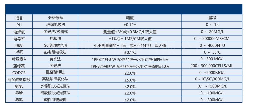 根据《地表水自动检测技术规范(试行)》 (HJ915-2017)及《光谱法水质在线监测系统》 (T/CWEC 13-2019)中关于监测系统建设及运行管理要求。水站的仪器及检测原理应根据水体特征污染因子、仪器适用性、监测结果可比性以及水体功能进行确定。根据《地表水自动检测技术规范(试行)》(HJ915-2017) 附录A 仪器性能要求及《光谱法水质在线快速监测系统》 (T/CWEC 13-2019)等其他新型实用检测方法